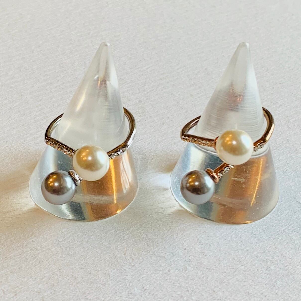 白色、グレー色の2色のパールの組み合わせが素敵なリングです。